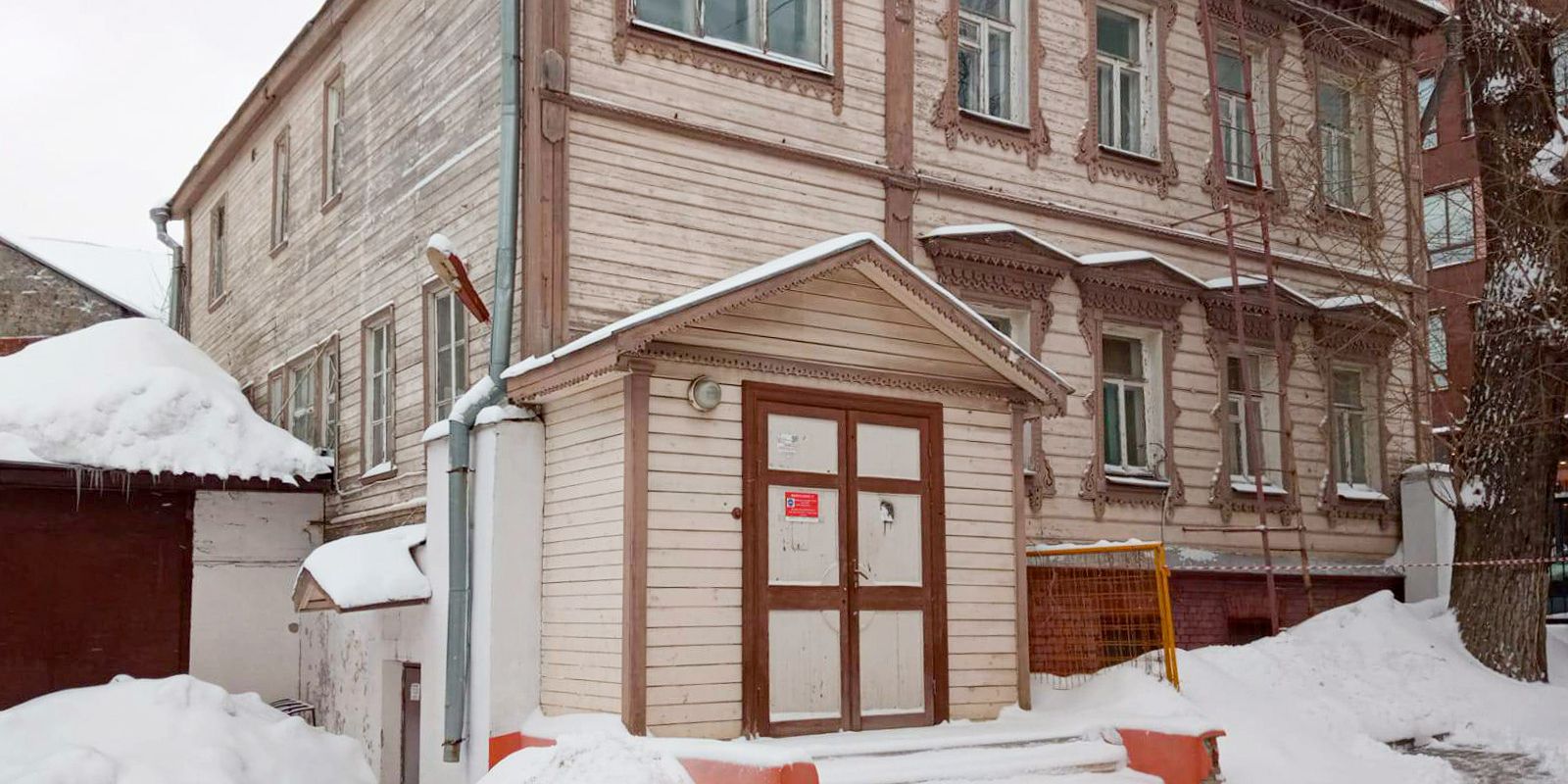 Первый лот — двухэтажное деревянное здание c каменным полуподвалом общей площадью 341 квадратный метр, находящееся по адресу: Большой Саввинский переулок, дом 8, строение 5. Жилой дом ремесленно-технического училища Общества распространения технических знаний является объектом культурного наследия регионального значения. Одноэтажный каменный корпус был возведен по проекту архитектора Сергея Залесского в 1880 году, а в 1882-м надстроили два деревянных этажа, оформленных в псевдорусском стиле с резными наличниками, пилястрами и карнизом.