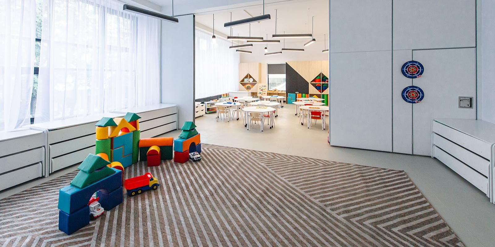 В здании есть групповые комнаты, музыкальный зал, административный и пищевой блоки, а также просторный холл.